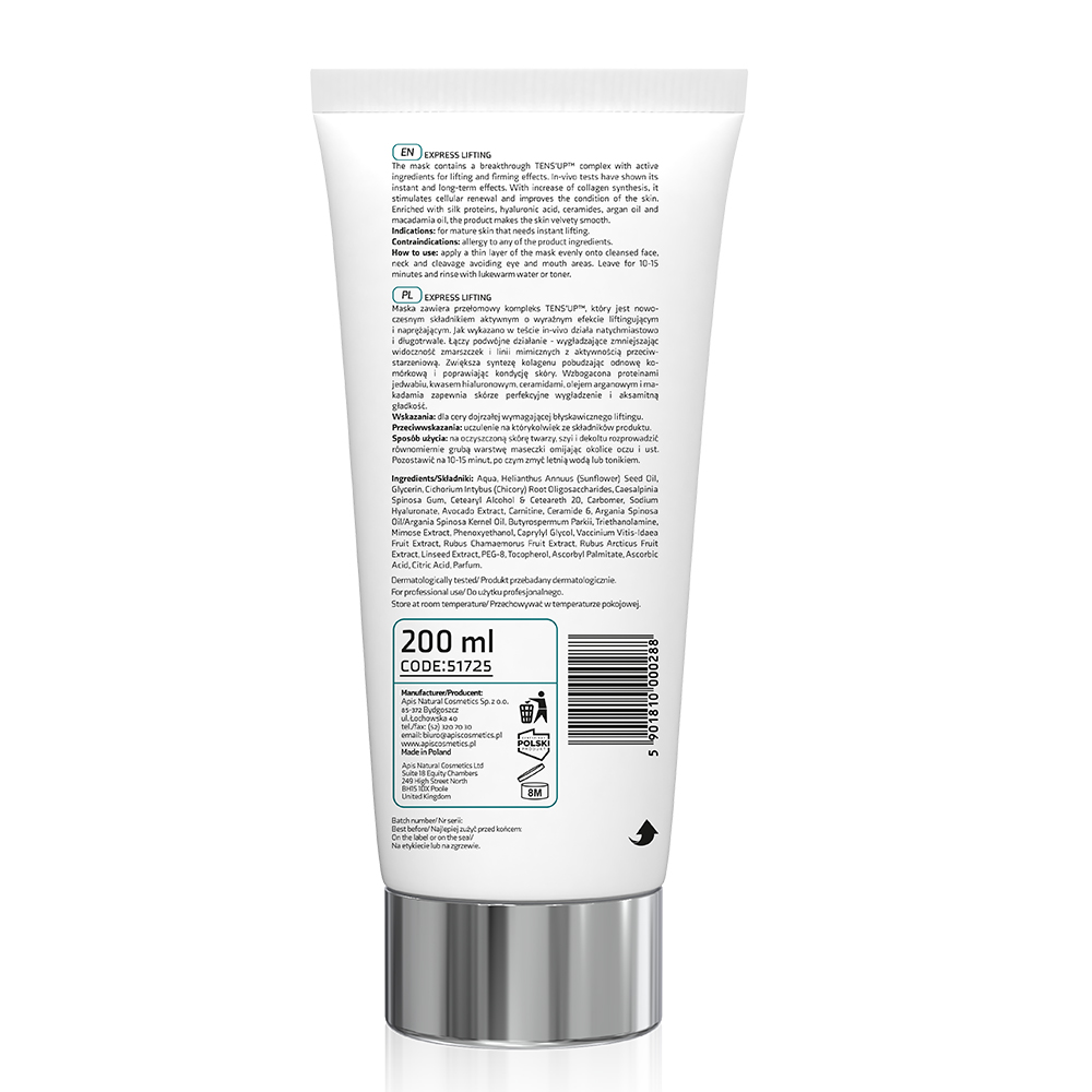 Kremowa maska z przełomowym kompleksem TENS'UP™, który jest nowoczesnym składnikiem aktywnym o wyraźnym efekcie liftingującym i naprężającym. Skóra jest wygładzona, a zmarszczki mimiczne są mniej widoczne – co potwierdziły testy in-vivo*. Zwiększa również syntezę kolagenu i poprawia kondycję skóry. W połączeniu z kwasem hialuronowym, masłem shea i olejem arganowym zapewnia skórze perfekcyjne wygładzenie.